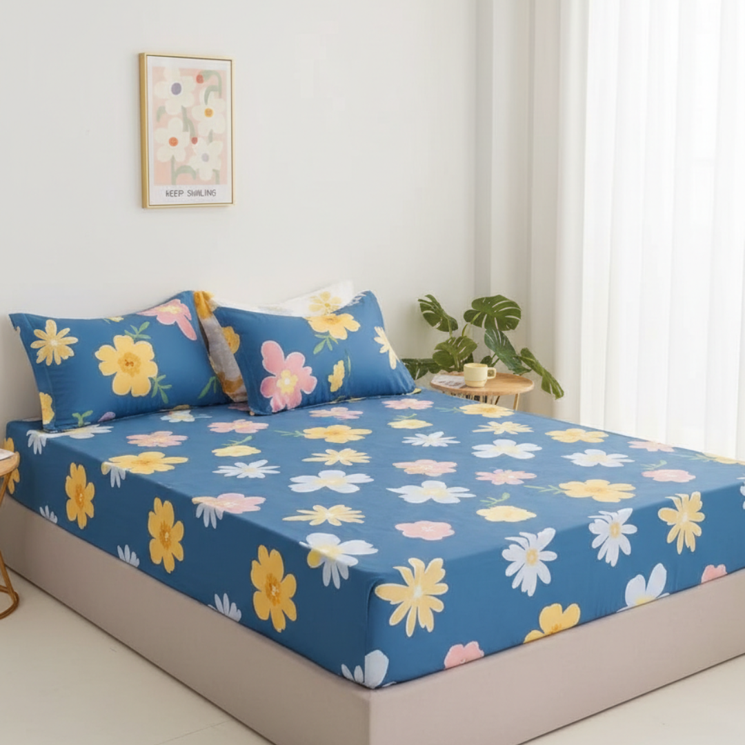 Brighten your bedroom with the Sunlit Daisy Blue Set, designed to bring a cheerful and airy feel to your home. This set features a vibrant denim-blue background decorated with oversized, playful daisies in sunny yellow, soft pink, and crisp white. Made from premium 120 GSM microfiber, these sheets offer a thick, velvety feel that stays incredibly soft and smooth night after night.